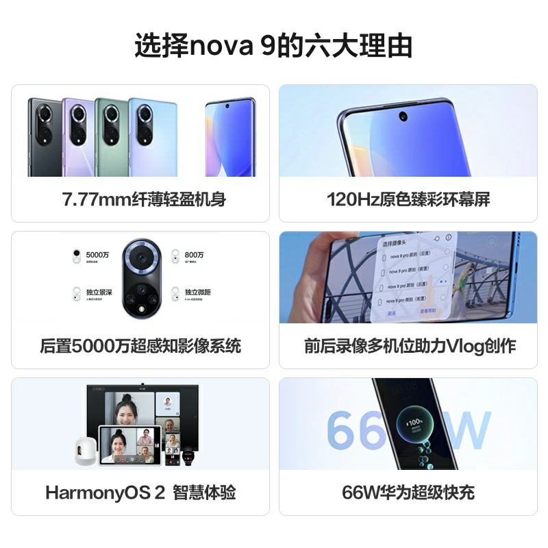 規格參數 拍照功能 后置攝像頭 5000萬像素高清攝像頭 + 800萬像素超廣角攝像頭+ 200萬像素景深攝像頭+ 200萬像素微距攝像頭 攝像頭類型 后置四攝+前置單攝 顯示 分辨率 FHD+ 2340*1080 像素 屏幕尺寸 6.57英寸 網絡 網絡類型 4G 全網通 網絡模式 雙卡雙待 機身詳情 款式 直板 存儲 存儲容量 8+128GB 8+256GB 基本參數 品牌 Huawei/華為 華為型號 NOVA 9 CPU核心數 八核 機身顏色 9號色 普羅旺斯 綺境森林 亮黑色 手機類型 智能手機 操作系統 HarmonyOS CPU品牌 高通