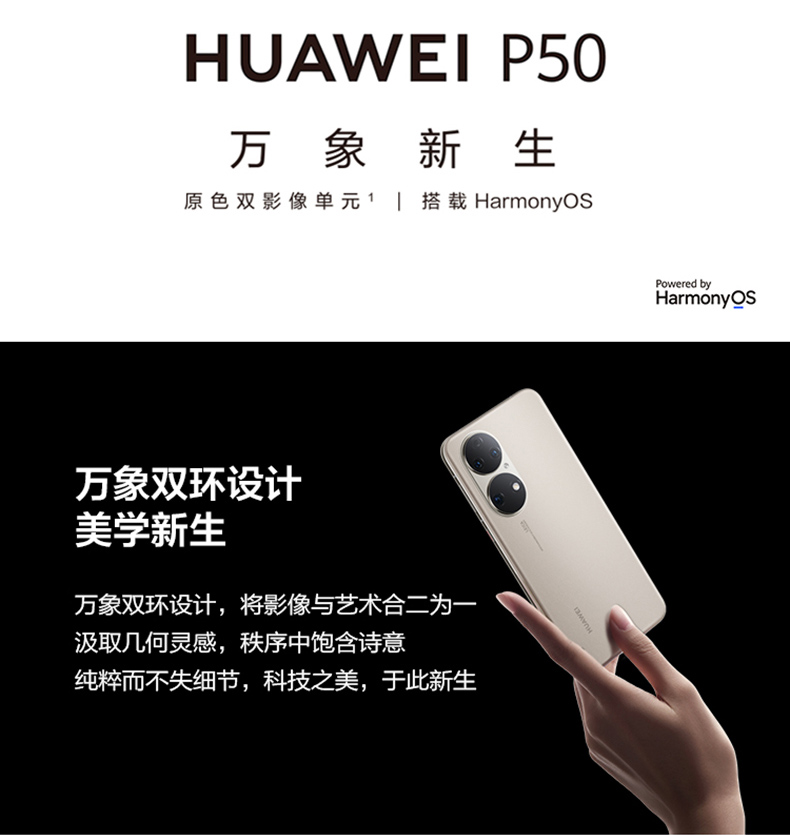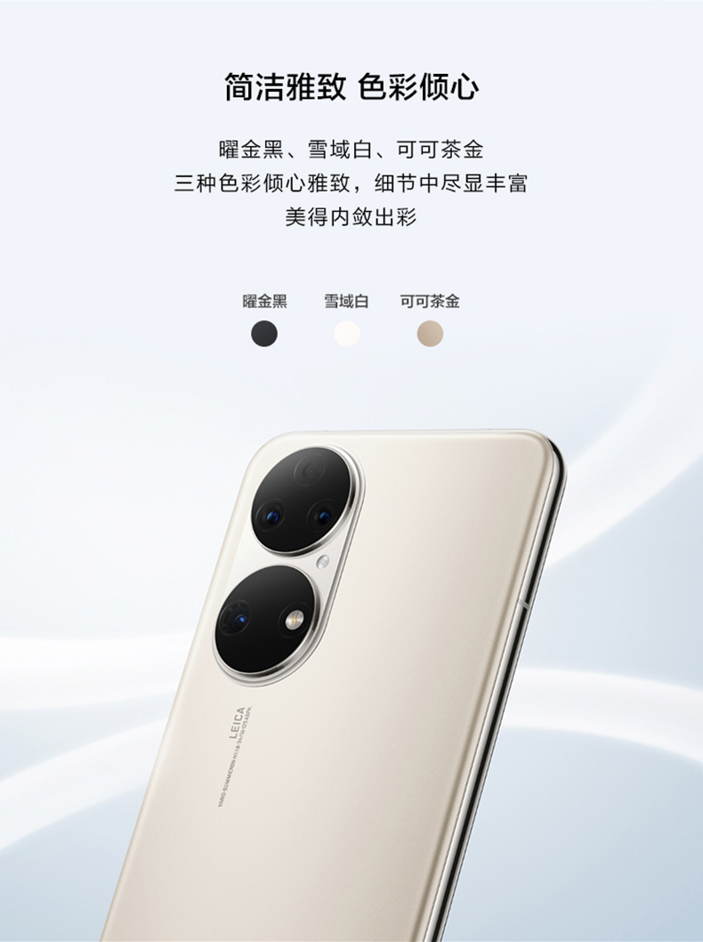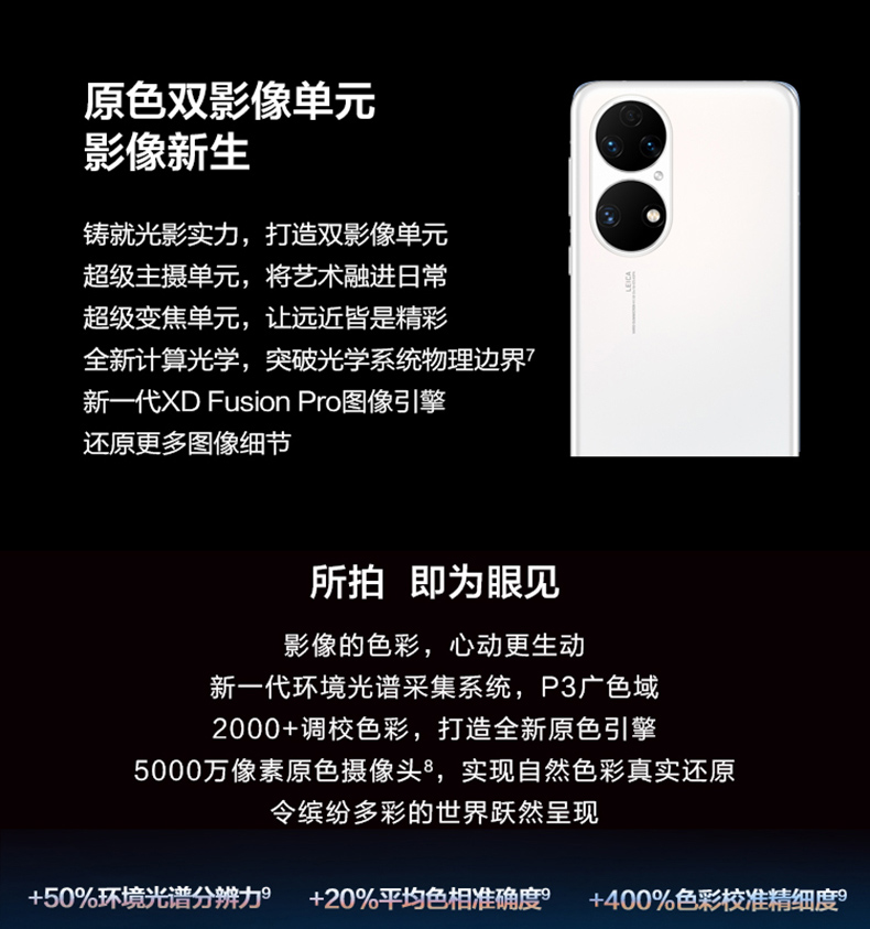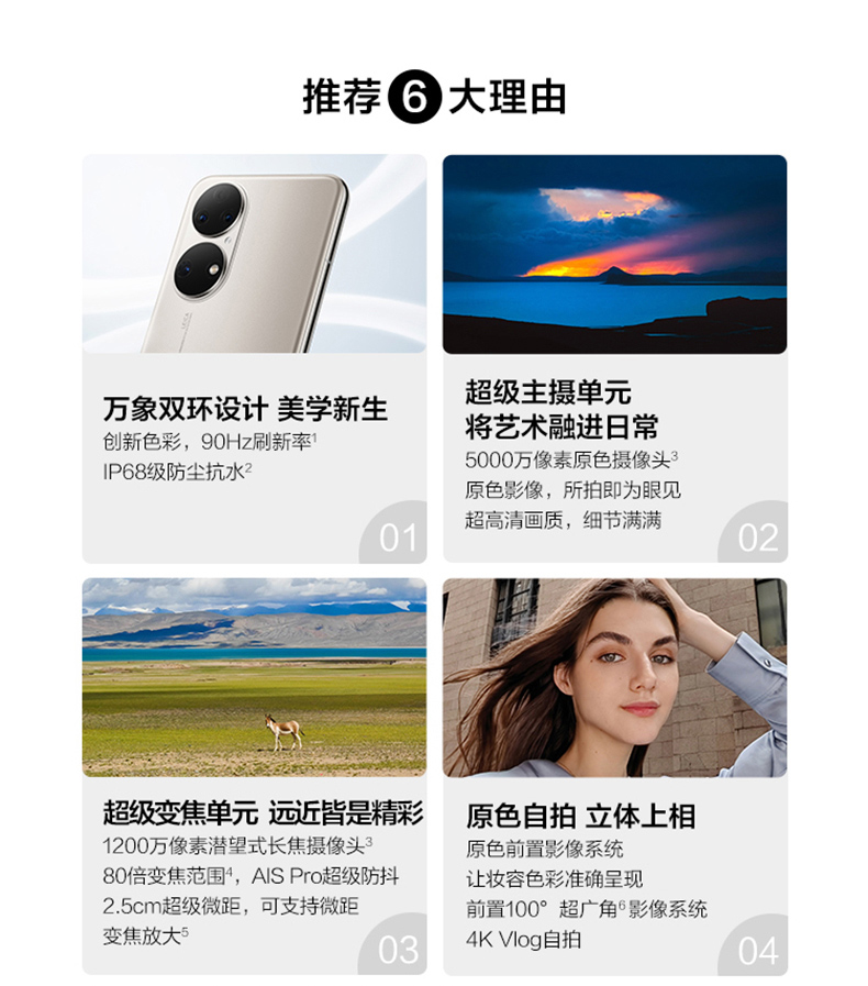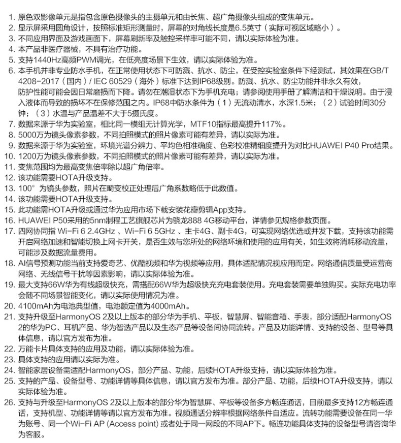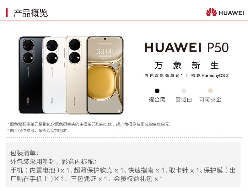 規格參數 拍照功能 后置攝像頭 5000萬像素原色攝像頭+ 1300萬像素超廣角攝像頭+ 1200萬像素長焦攝像頭 攝像頭類型 四攝像頭(前一后三) 顯示 分辨率 FHD+ 2700 x 1224 像素 屏幕尺寸 6.5英寸 網絡 網絡類型 4G 全網通 網絡模式 雙卡雙待 機身詳情 款式 直板 存儲 存儲容量 8+128GB 8+256GB 基本參數 品牌 Huawei/華為 華為型號 P50 CPU核心數 八核 機身顏色 曜金黑 雪域白 可可茶金 手機類型 智能手機 操作系統 HarmonyOS CPU品牌 高通