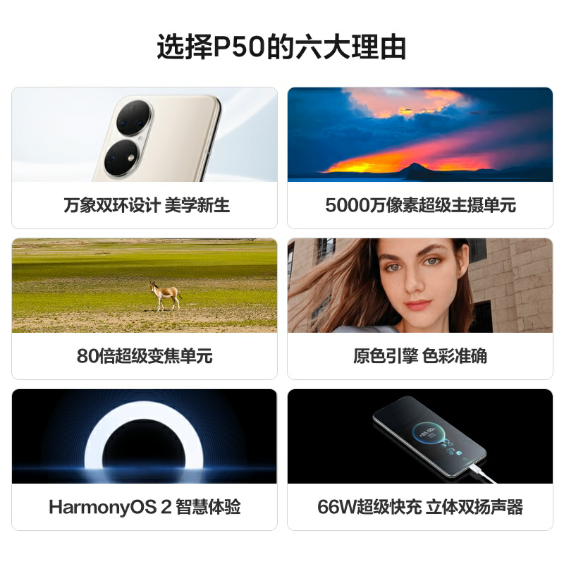 規格參數 拍照功能 后置攝像頭 5000萬像素原色攝像頭+ 1300萬像素超廣角攝像頭+ 1200萬像素長焦攝像頭 攝像頭類型 四攝像頭(前一后三) 顯示 分辨率 FHD+ 2700 x 1224 像素 屏幕尺寸 6.5英寸 網絡 網絡類型 4G 全網通 網絡模式 雙卡雙待 機身詳情 款式 直板 存儲 存儲容量 8+128GB 8+256GB 基本參數 品牌 Huawei/華為 華為型號 P50 CPU核心數 八核 機身顏色 曜金黑 雪域白 可可茶金 手機類型 智能手機 操作系統 HarmonyOS CPU品牌 高通