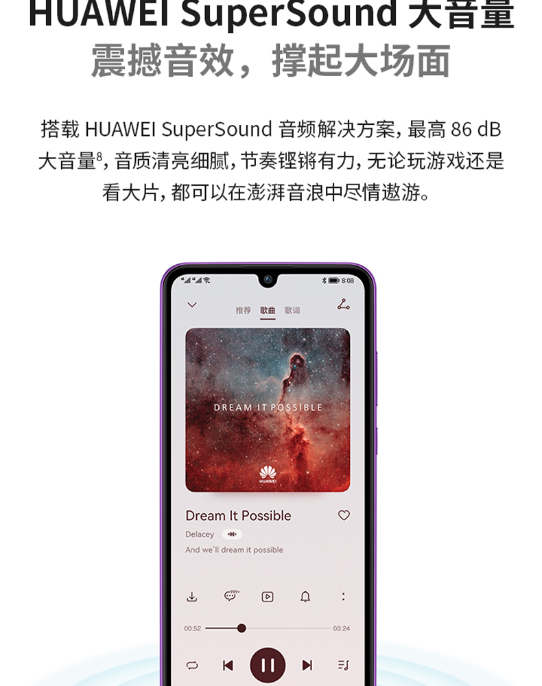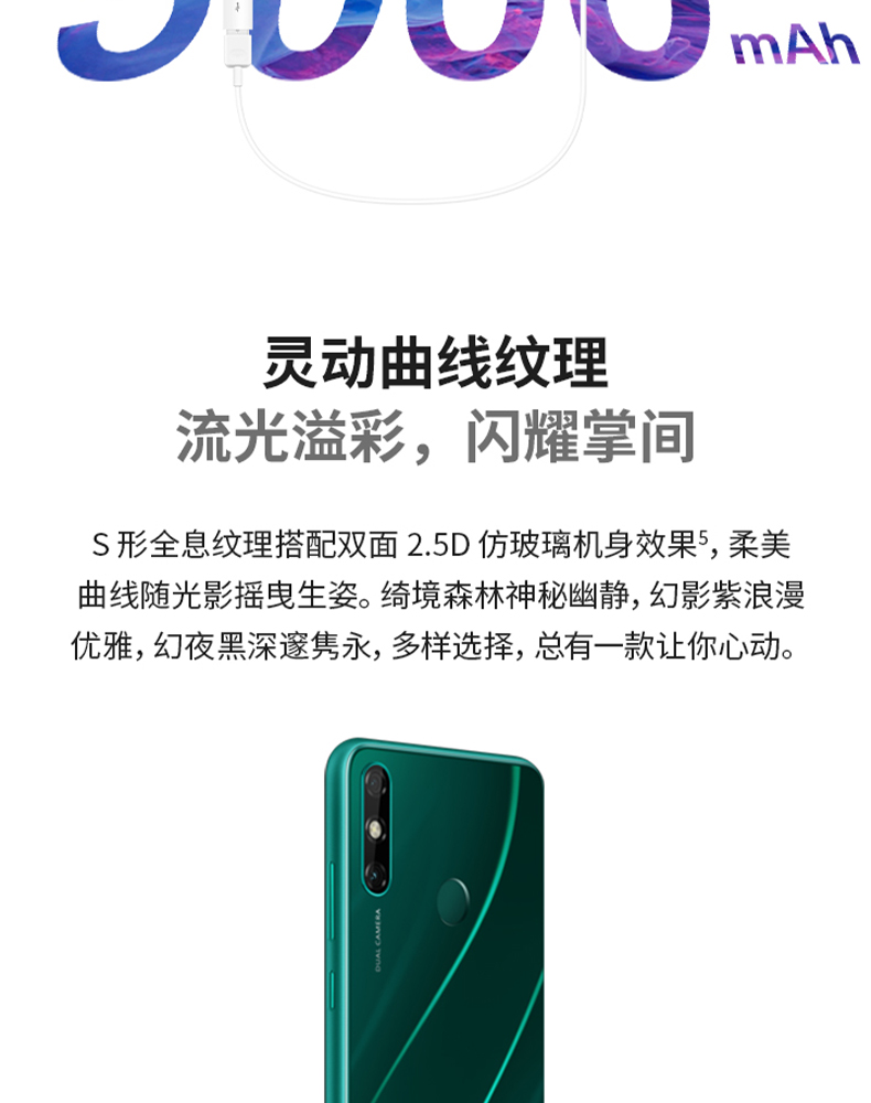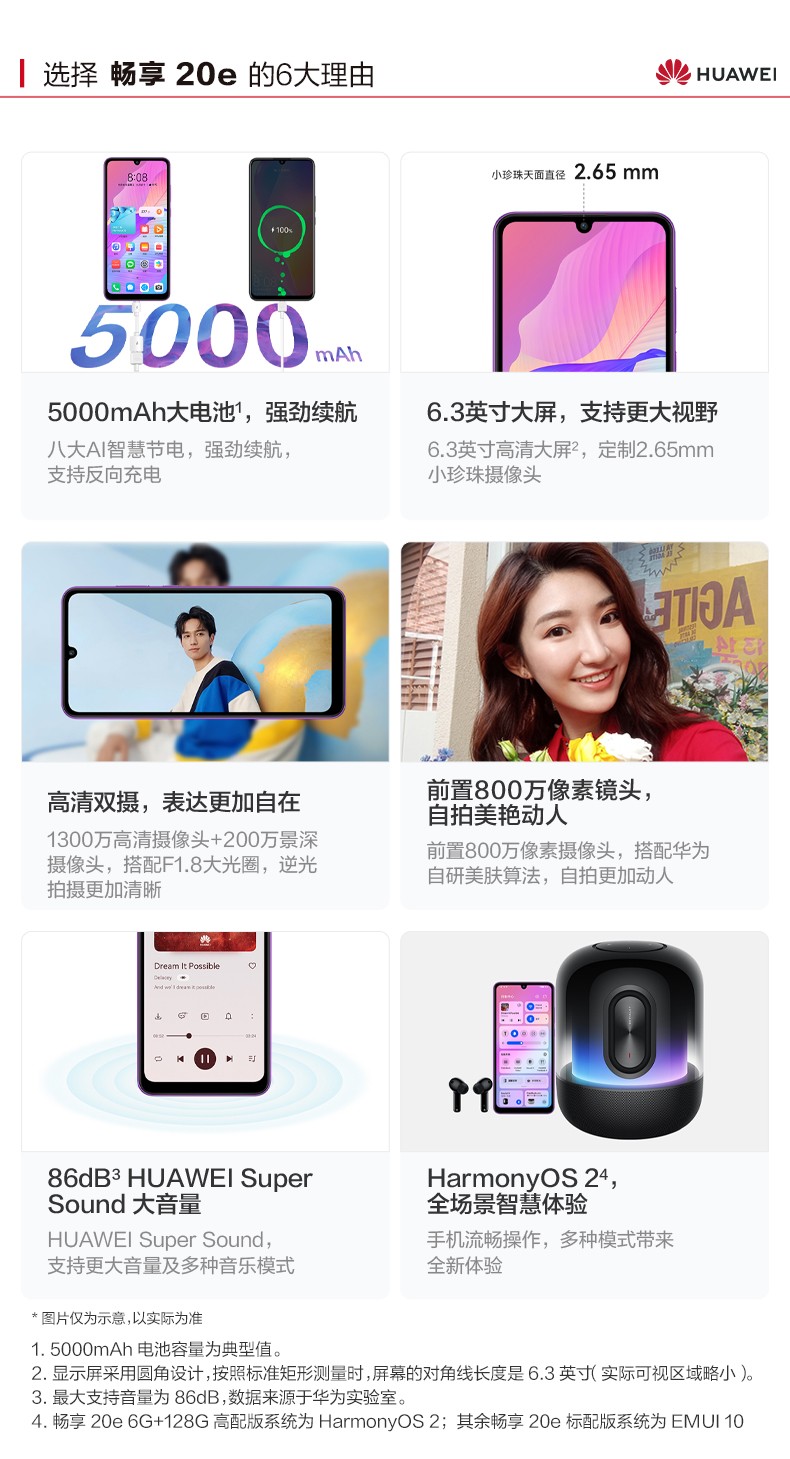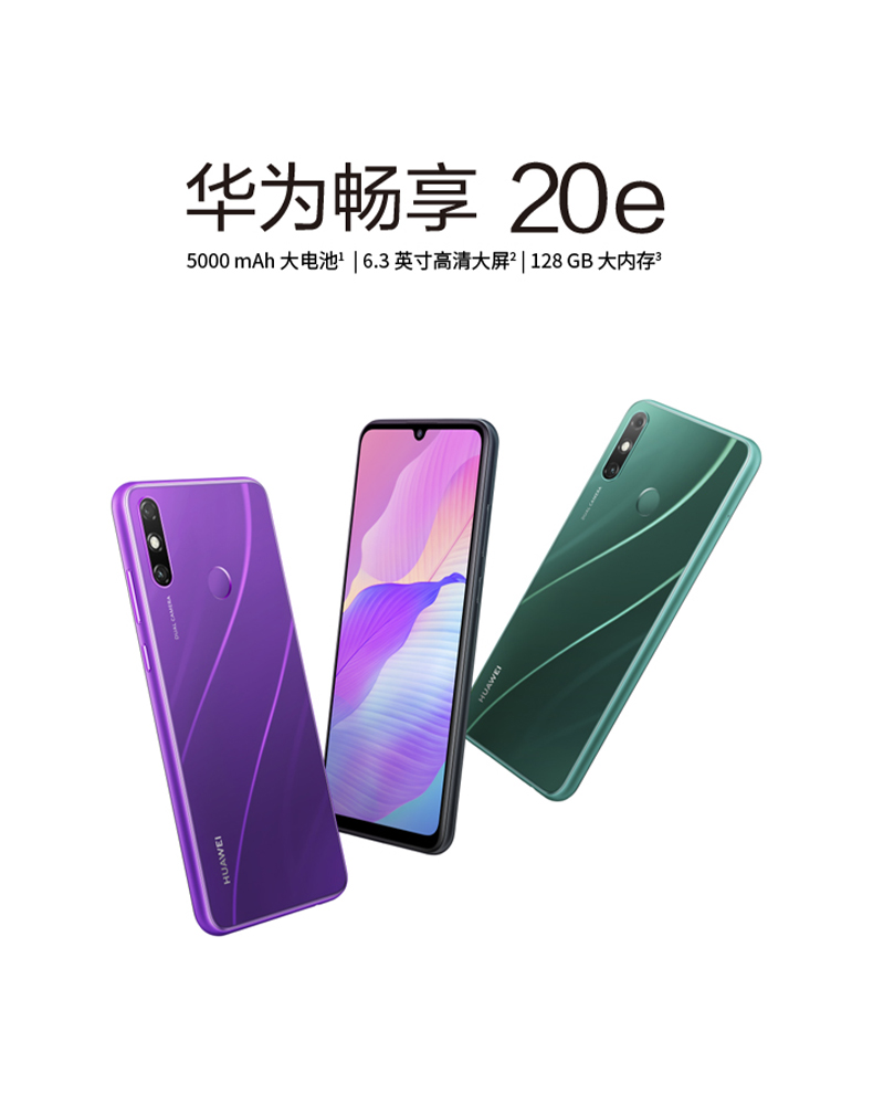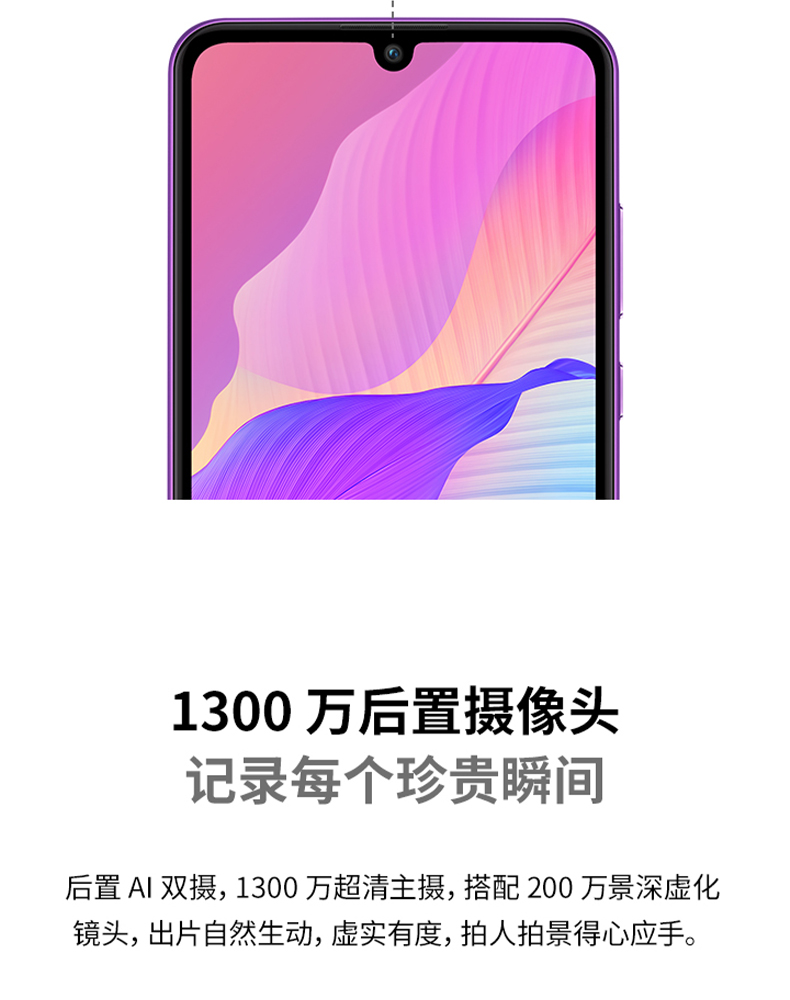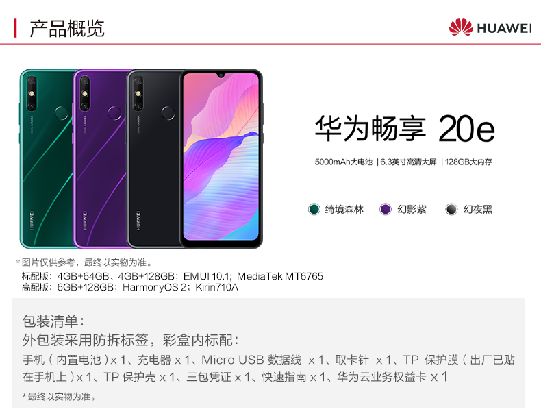 規格參數 拍照功能 后置攝像頭 1300萬像素攝像頭+200萬像素攝像頭 攝像頭類型 三攝像頭(后雙) 顯示 分辨率 HD+1600x720像素 屏幕尺寸 6.3英寸 網絡 網絡類型 4G全網通 網絡模式 雙卡雙待 機身詳情 款式 直板 存儲 存儲容量 4+64GB 4+128GB 6+128GB 基本參數 品牌 Huawei/華為 華為型號 暢享 20e 機身顏色 綺境森林 幻影紫 幻夜黑 手機類型 智能手機 CPU品牌 聯發科