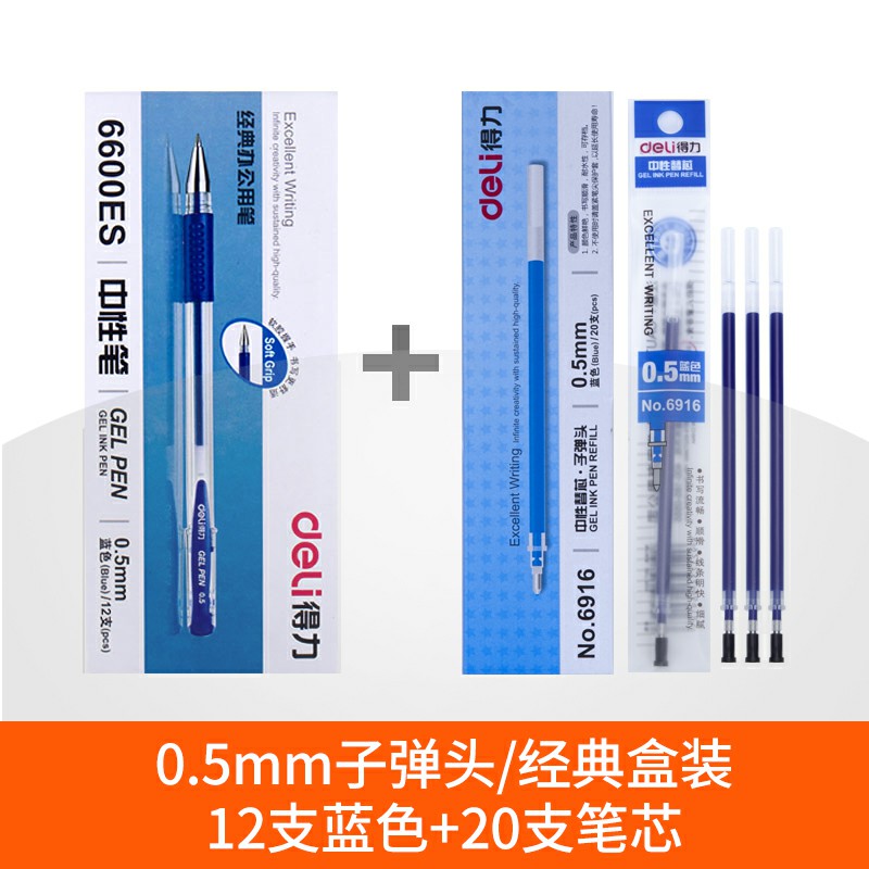 12支藍(lán)色+20支筆芯-得力文具中性筆學(xué)生用黑色0.5mm子彈頭水筆藍(lán)紅簽字筆批改筆記賬筆辦公用品書寫工具碳素筆50/12支裝